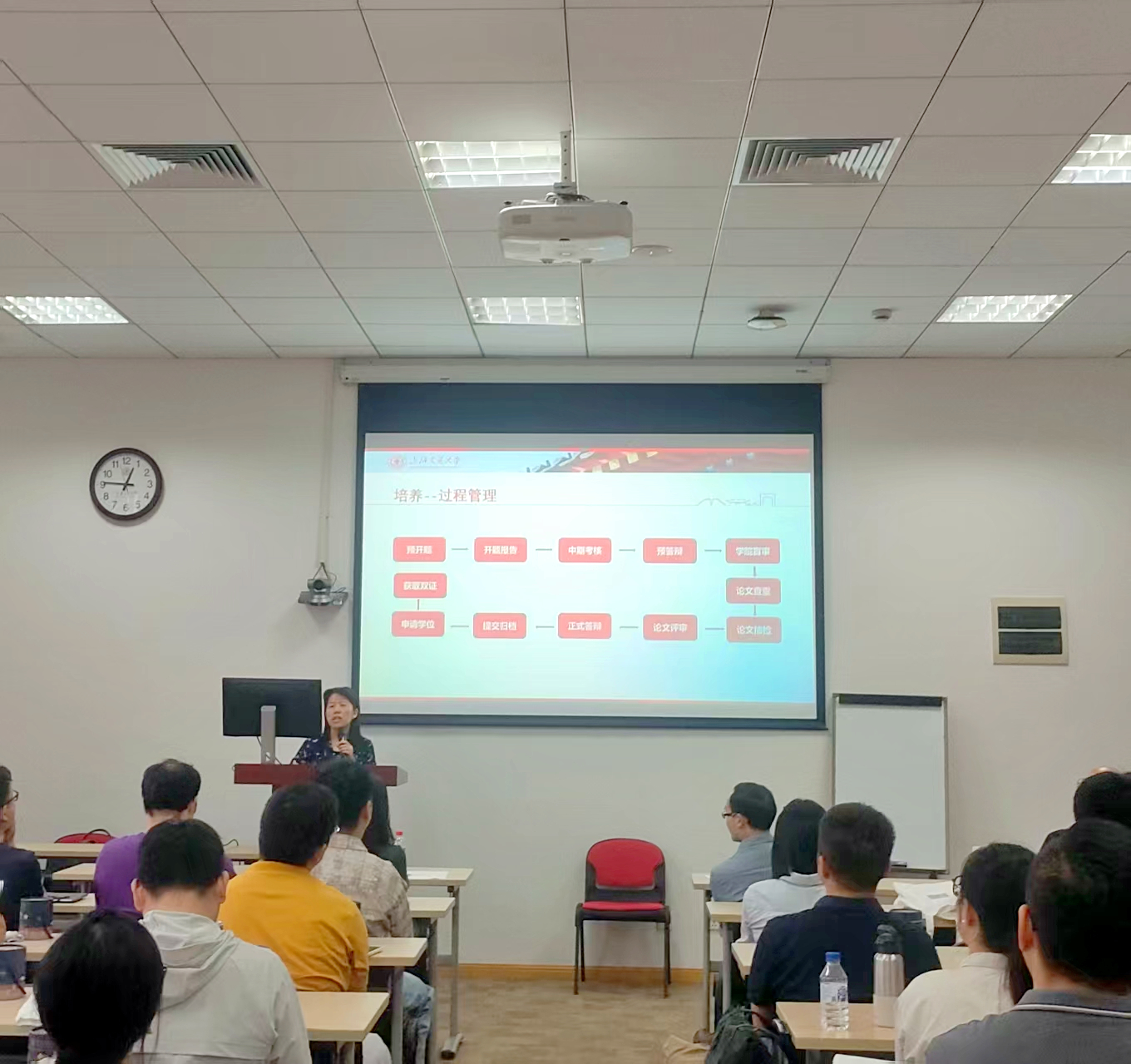 随后,工程教育中心贾敬华老师开展新生入学培训。她详细讲解了MEM 项目的课程体系、培养方案、学习资源及学位申请流程等,并针对平衡学习与工作、高效利用校园资源等实用问题给出建议,为新生快速适应校园生活提供指引。